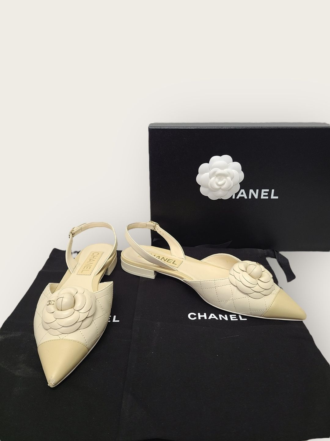 Produktname: Beige Lammleder Zwei-Ton Camellia Flach Slingback 38.5