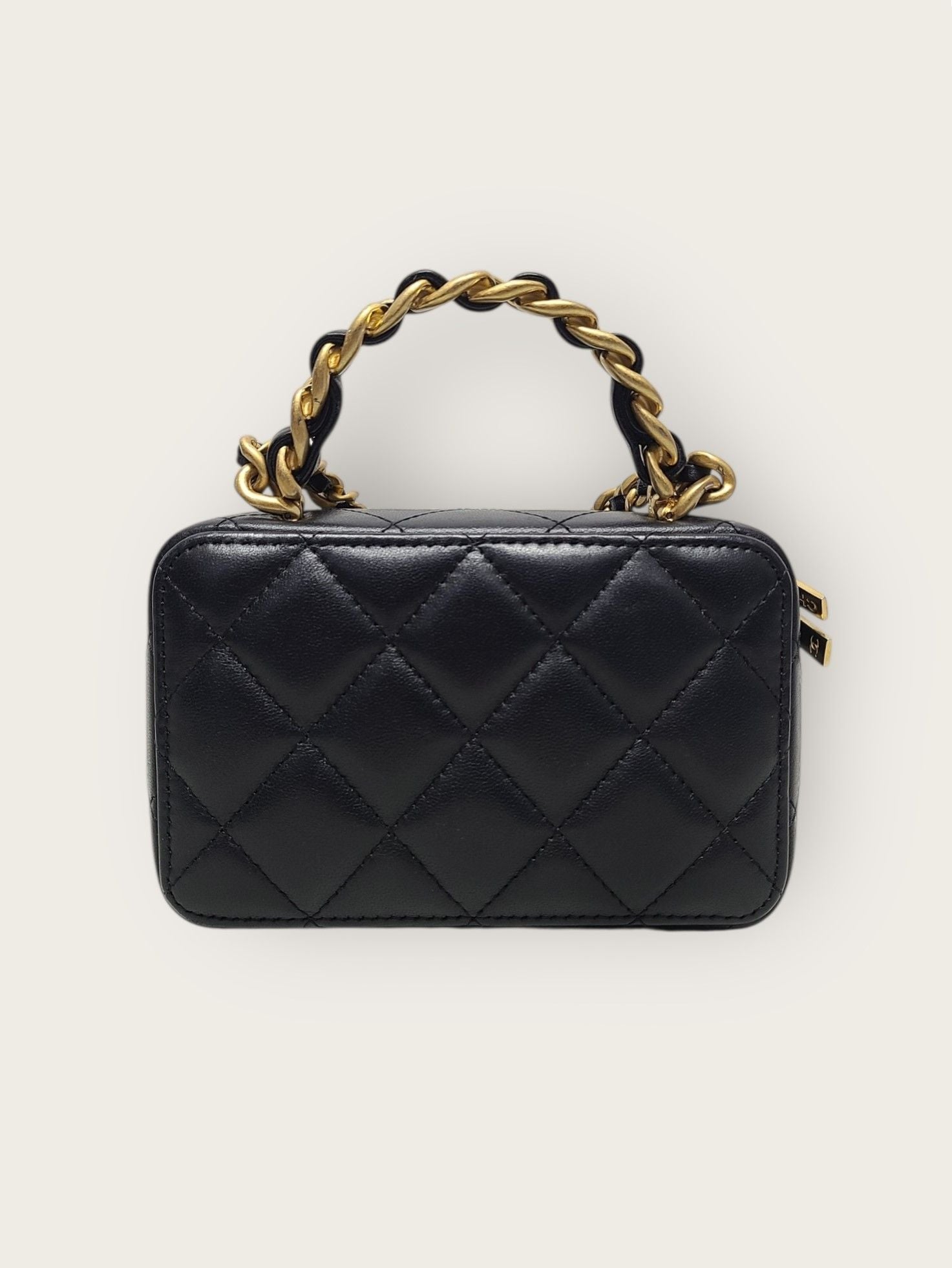 schwarzes lammleder goldfarbene top-handle ketten kosmetik mini vanity bag innenchip 150789983