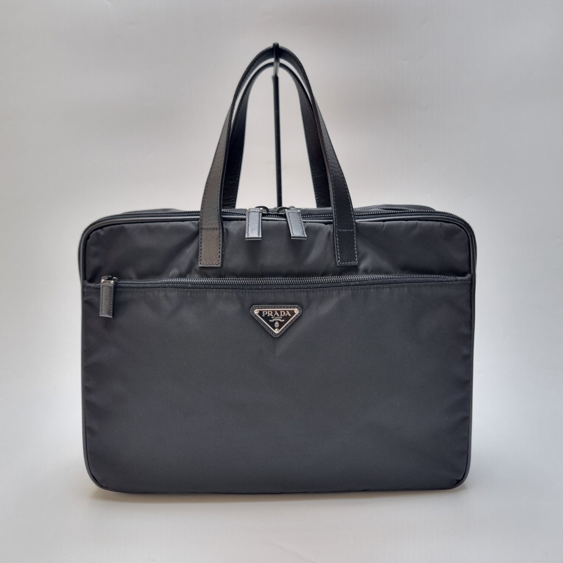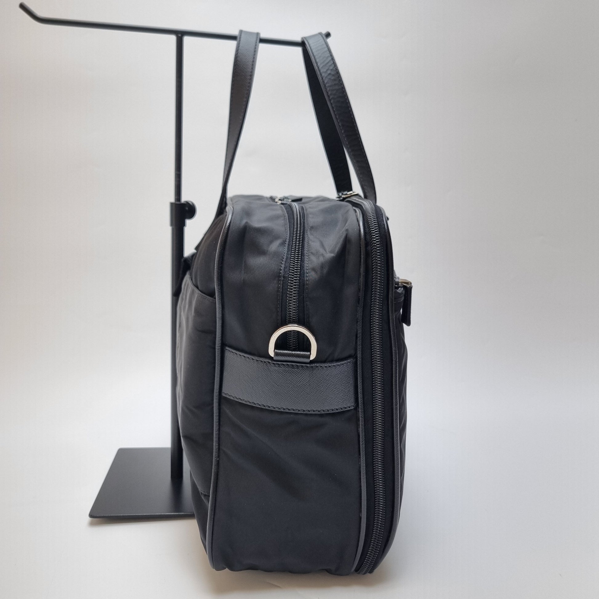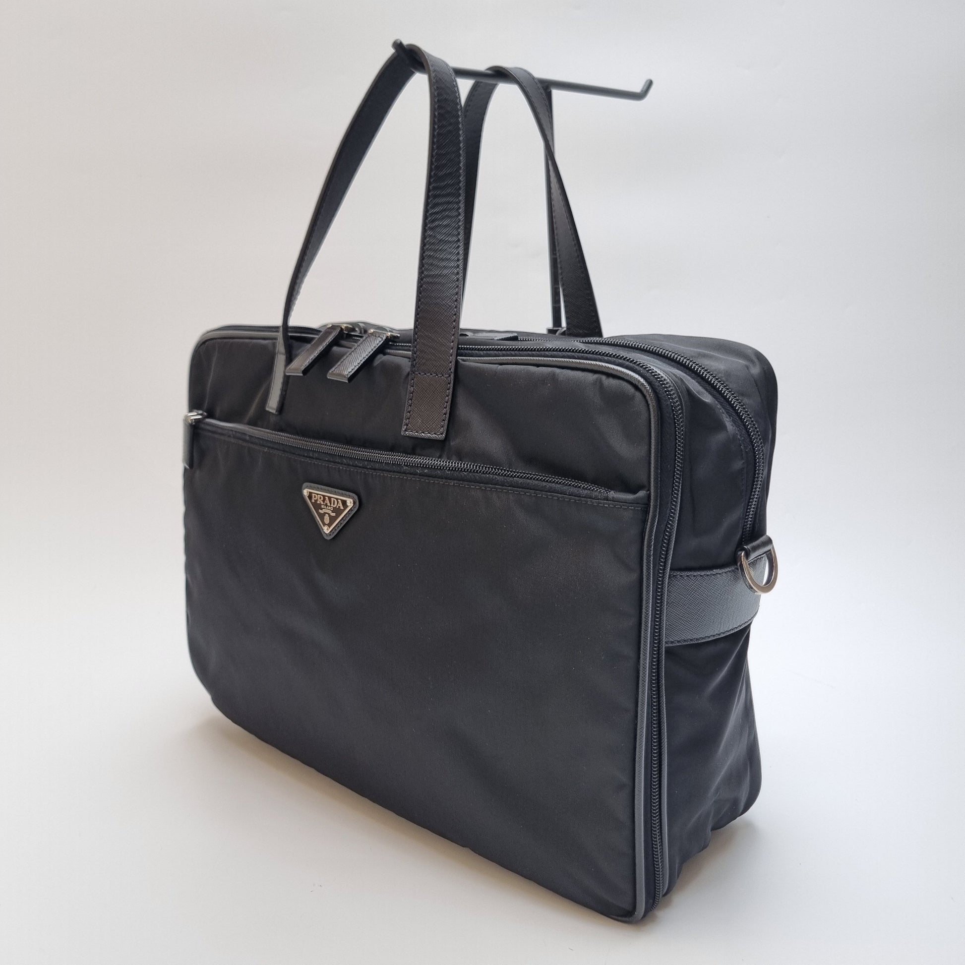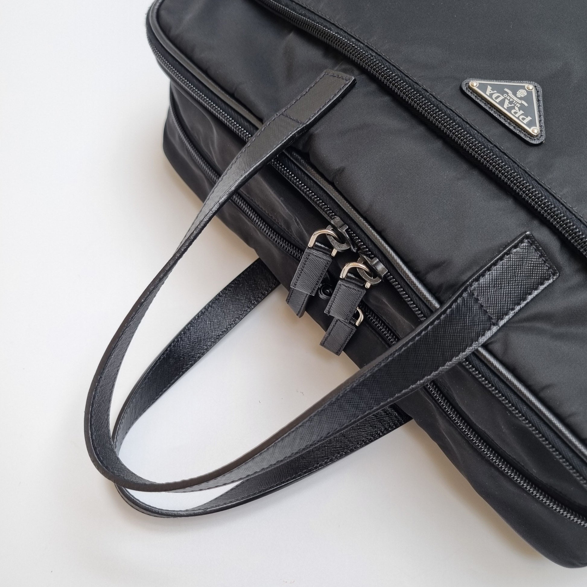 - Die Kombination aus strapazierfähigem Nylonkörper und Saffiano-Ledergriffen spiegelt das minimalistische und stilvolle Design wider.