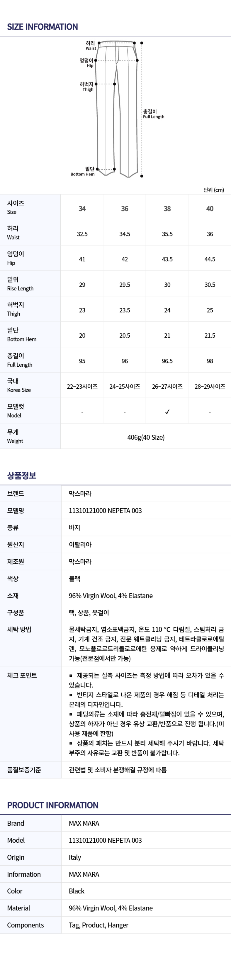 - Available sizes: 34, 36, 38, 40