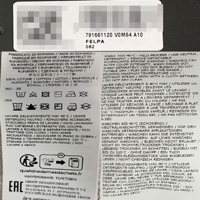 - Material: Refer to tags, labels, etc.