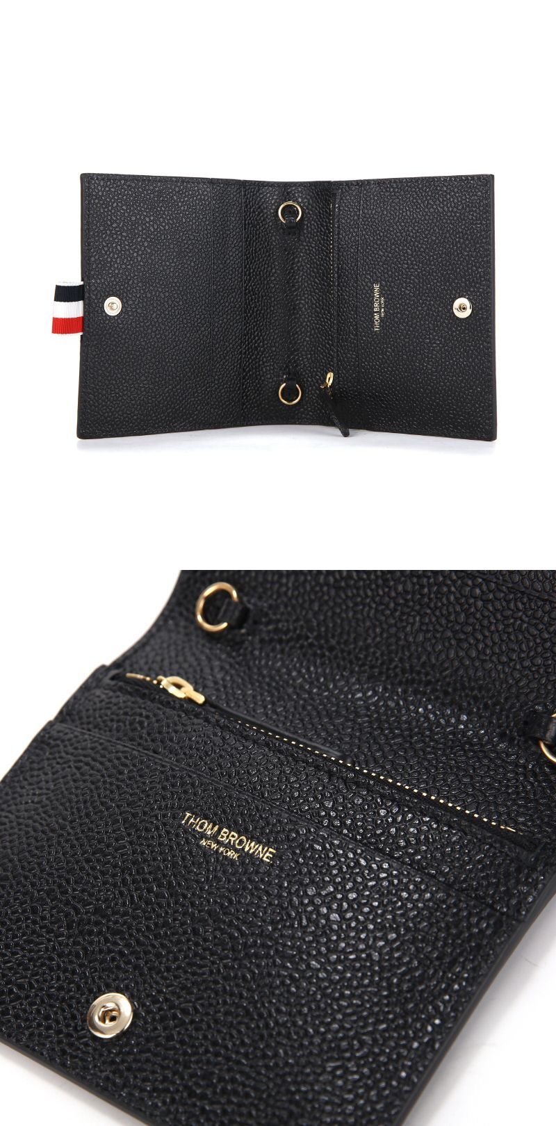 Product Name: Thom Browne Pebble Grain Three Bow Stripe Tab WOC Chain Card Wallet 144596008
