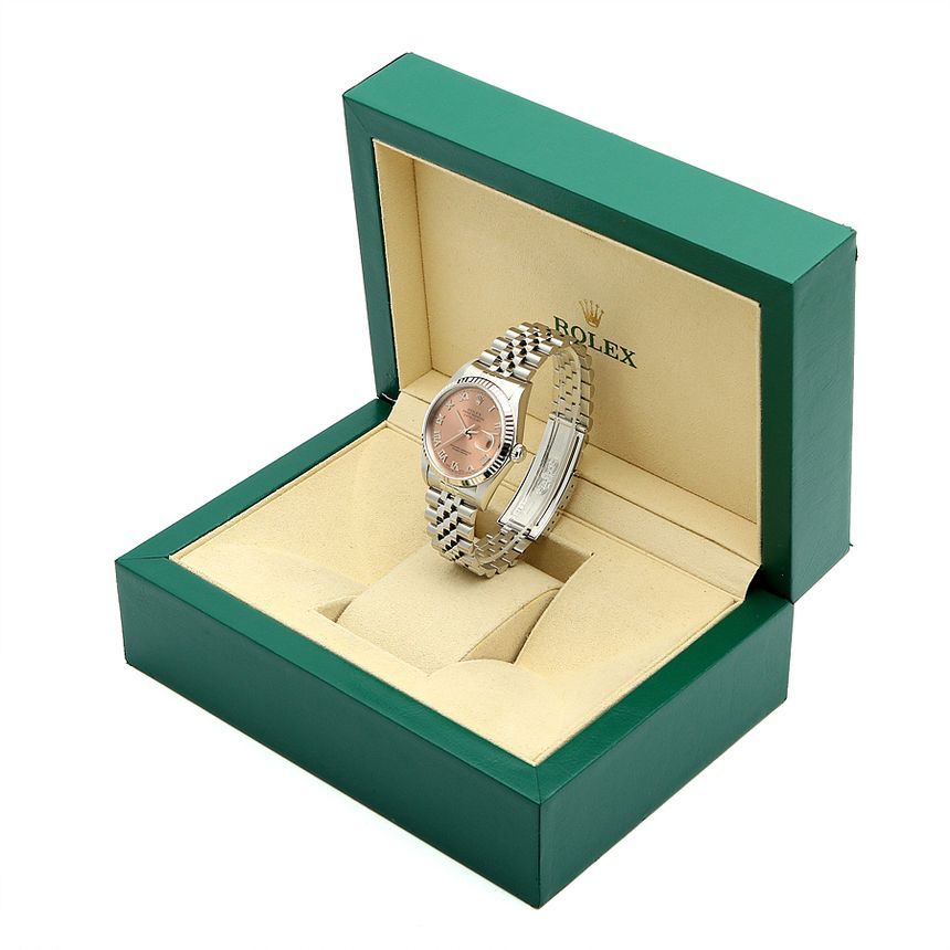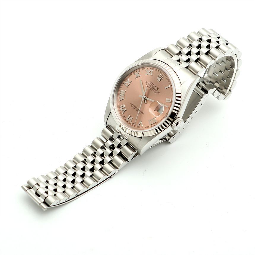 - Material: 36mm, steel, fluted bezel in 18K white gold, original salmon dial, Roman indices, date window, sapphire glass, water-resistant to 100m, automatic movement