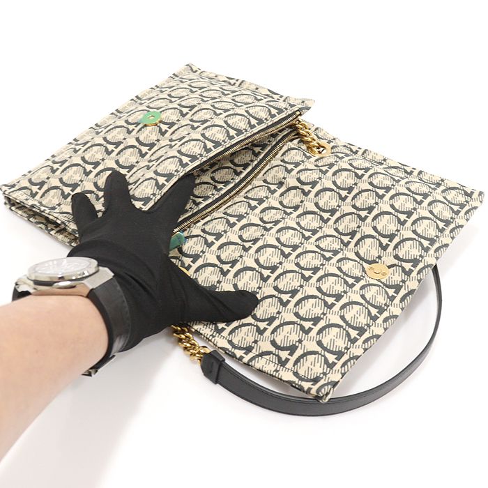 - ブラック / ベージュカラーのジャカード素材、ゴールドトーンのハードウェア、内部レザー素材のライニング