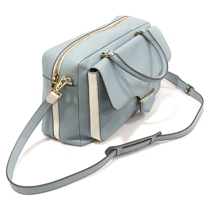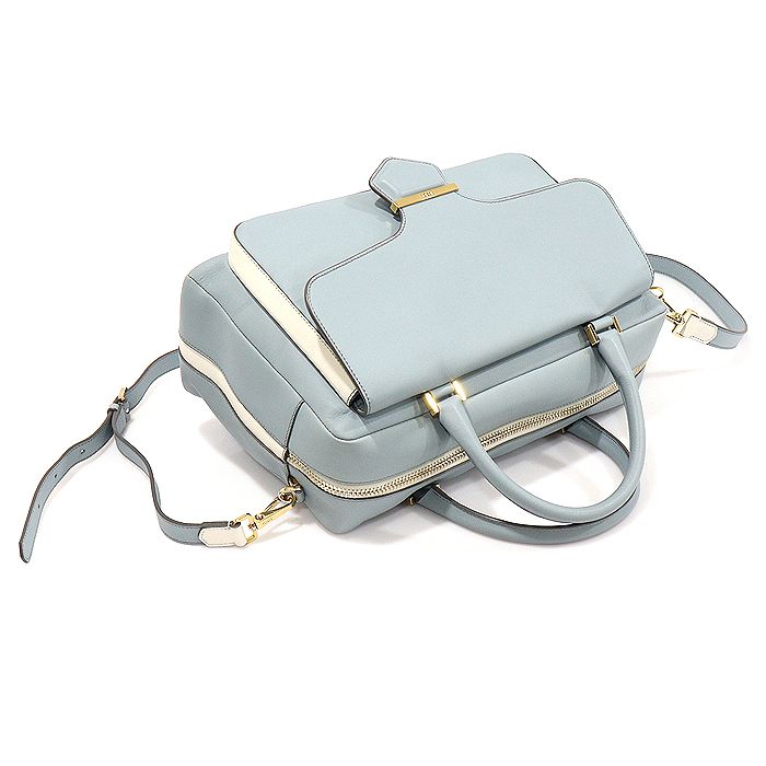 - スカイブルー / ホワイトカラーのレザー素材、ゴールドトーンのハードウェア装飾、内部にグレーのファブリック素材の裏地