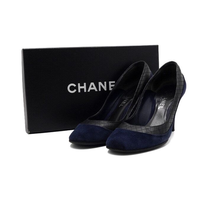- このチャンネルのネイビースウェードキルティングブラックレザーウィメンズパンプスです