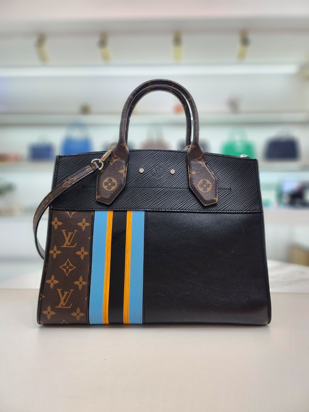- モノグラムキャンバス+レザーパネルの組み合わせ中央カラーストライプデザインのシーズンコレクション製品です。