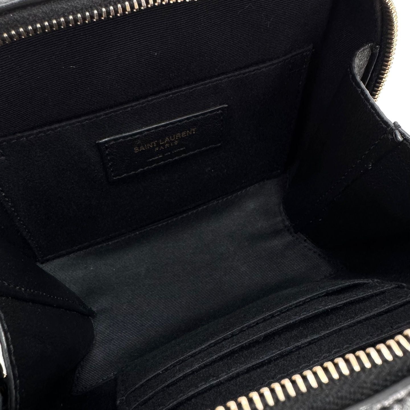 - ブラックカラーのキルティングレザーにゴールドトーンのYSLロゴが前面に大きく刻まれています。