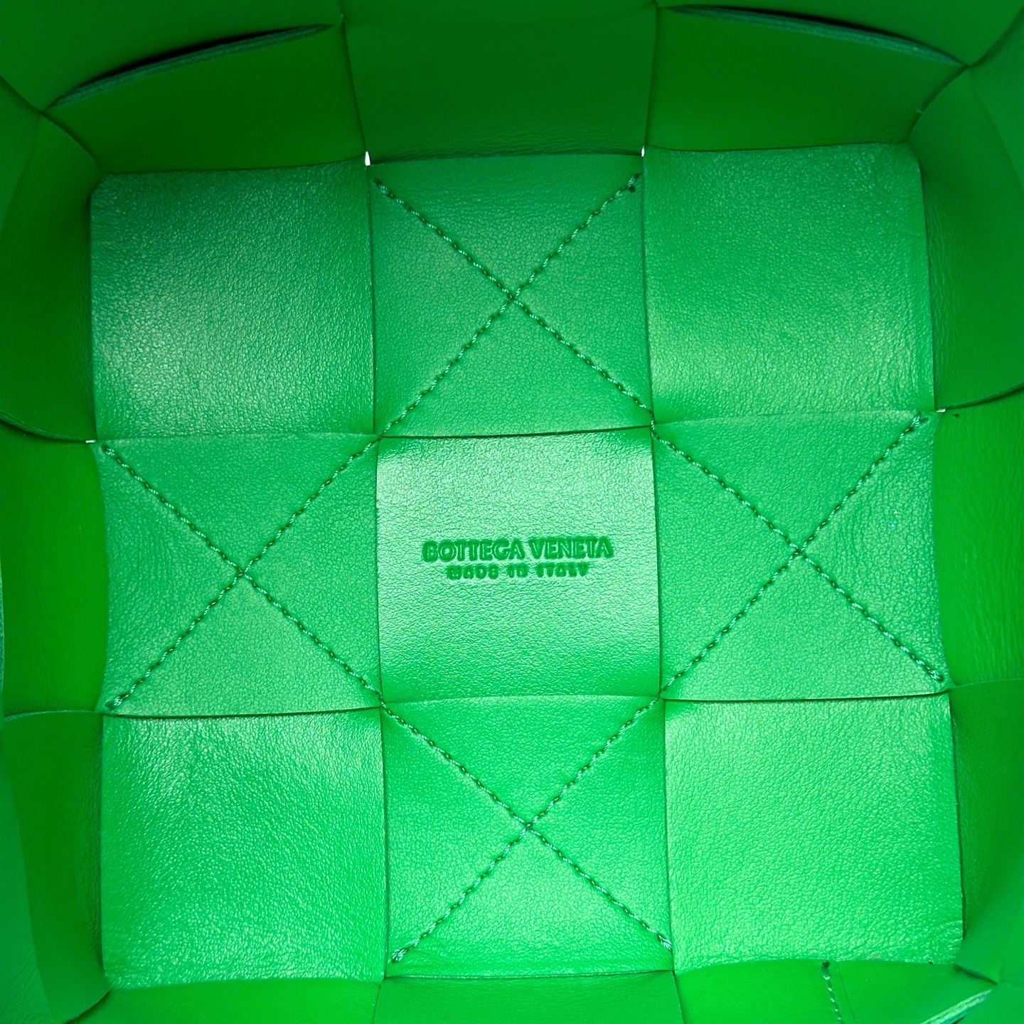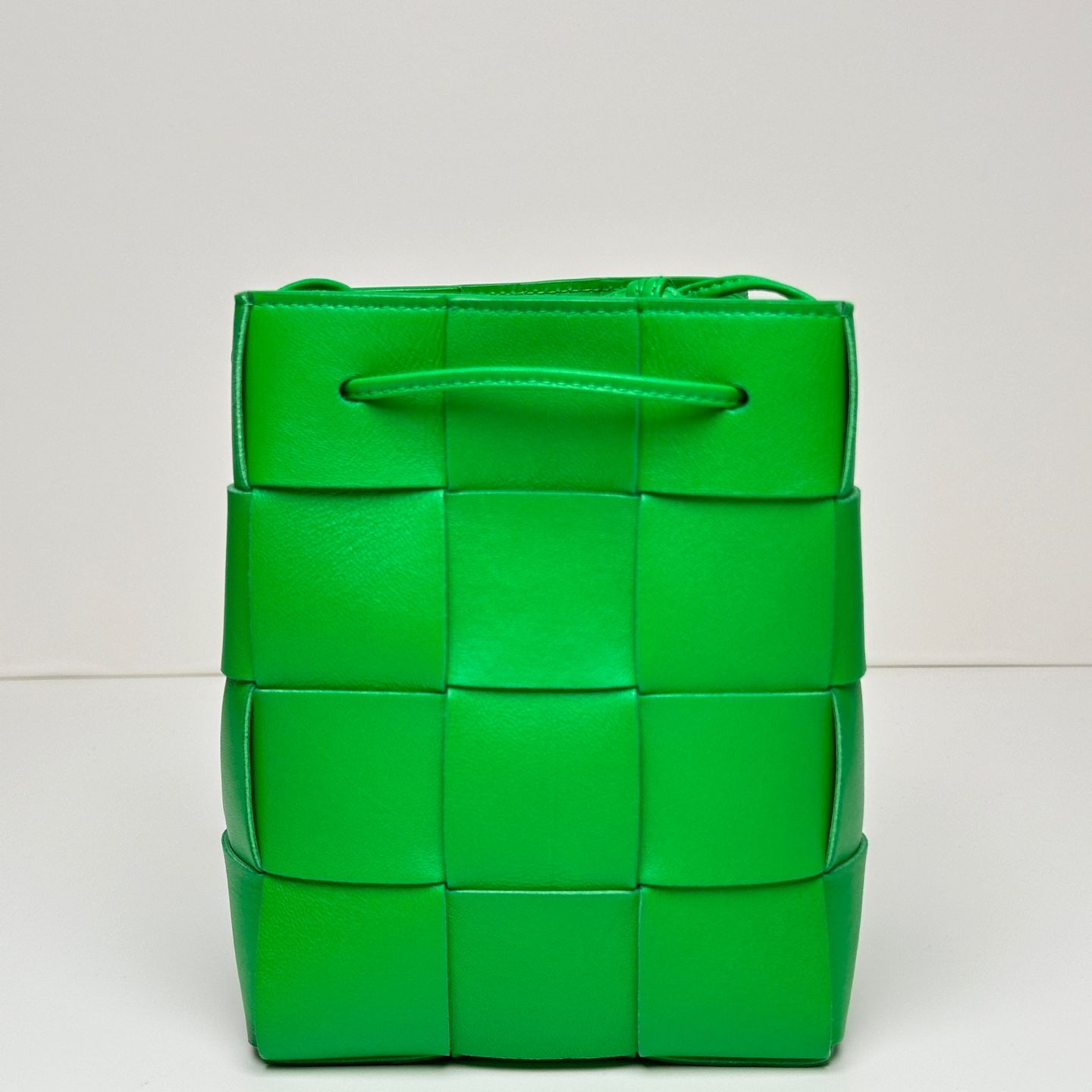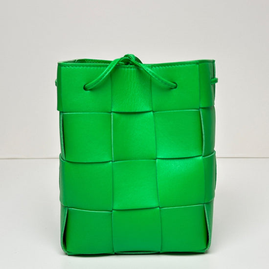 - Product description: A crossbody bucket bag showcasing artisan craftsmanship, made of soft lambskin in Intrecciato weaving.