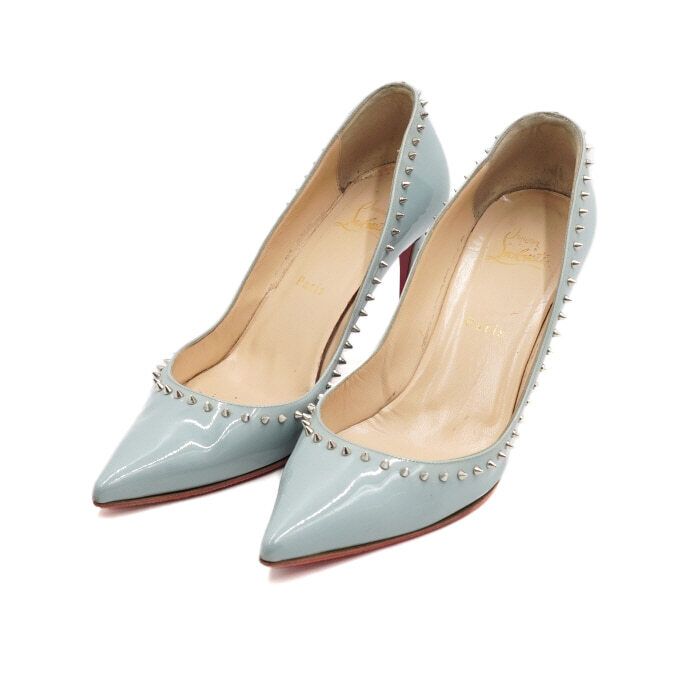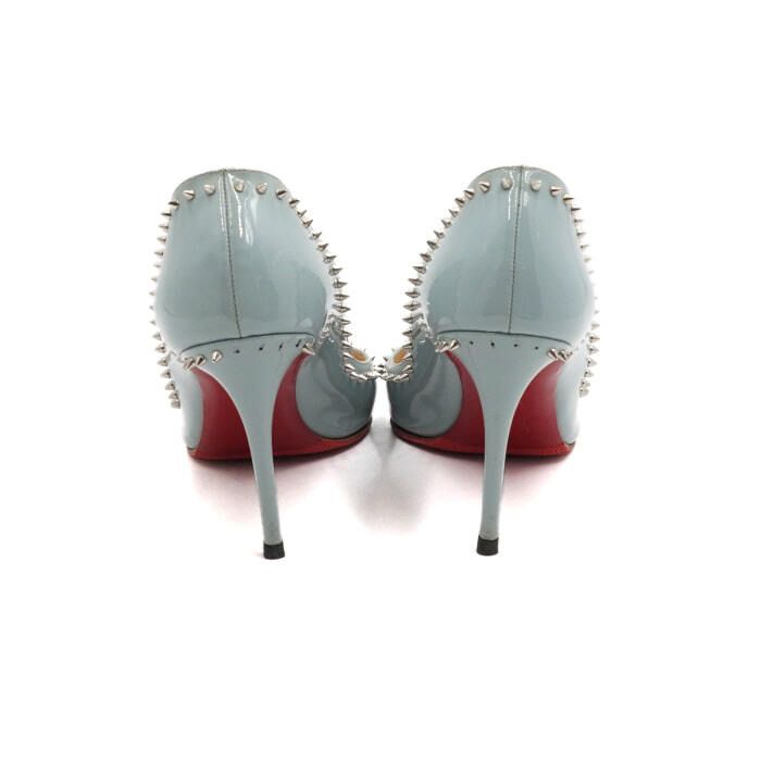 - Silver accessories: Christian Louboutin Sky Blue patent studded women's pumps with natural signs of wear such as stud peeling