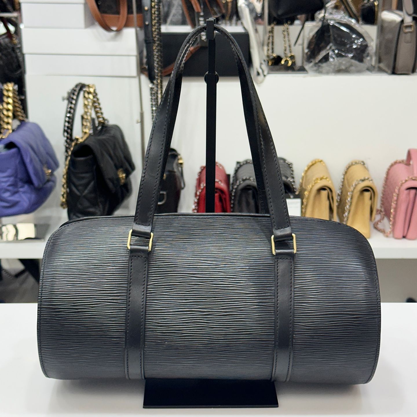 - Product description: Unique cylindrical silhouette combined with durable Épi leather creates a structural yet luxurious mood. Easily matches any style with a black color and offers excellent storage capacity, making it both practical and stylish.
