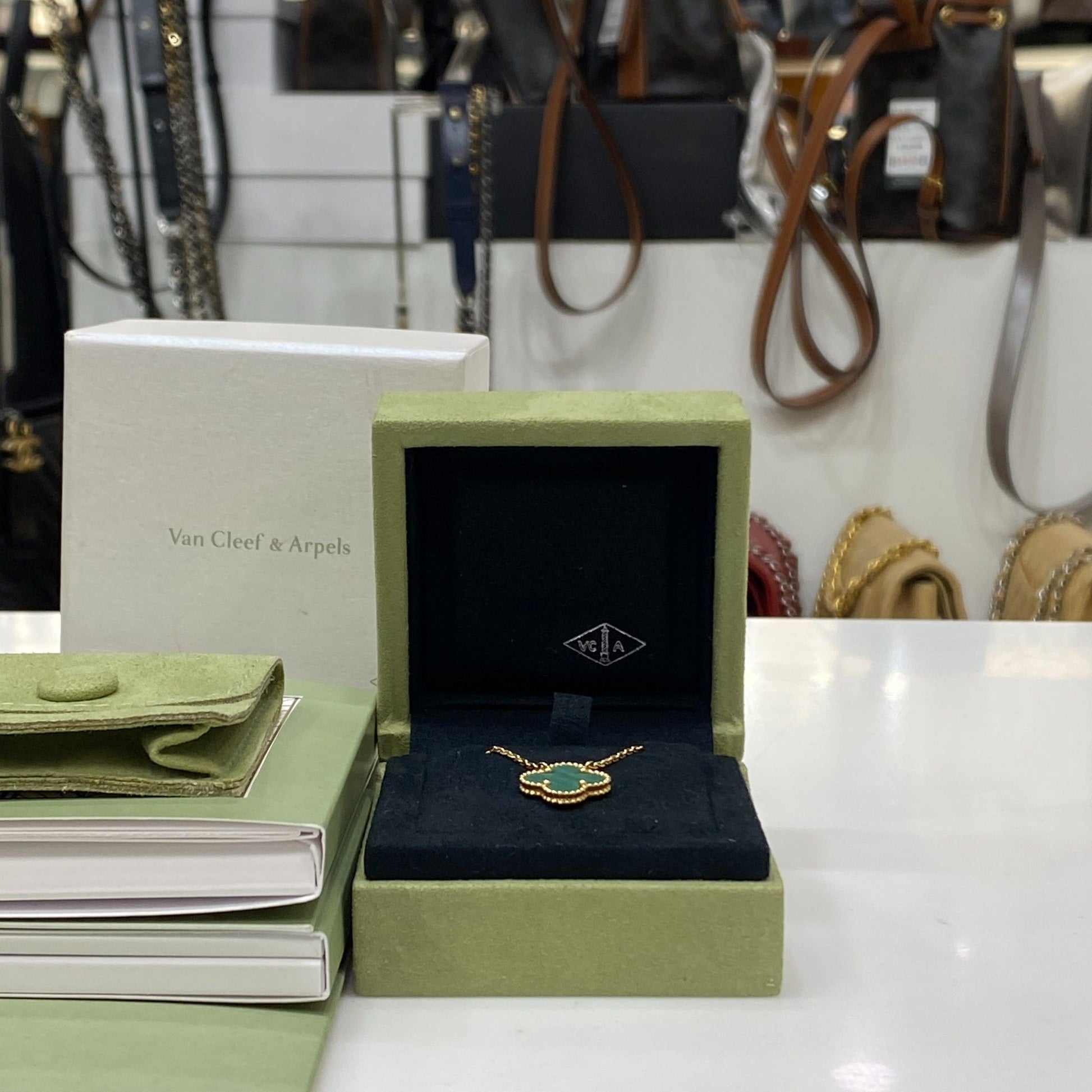 - Product description: Purchased in August 2019. Deep green natural malachite stone harmonizes with 18K yellow gold frame, offering the brand's unique elegant and classic charm.