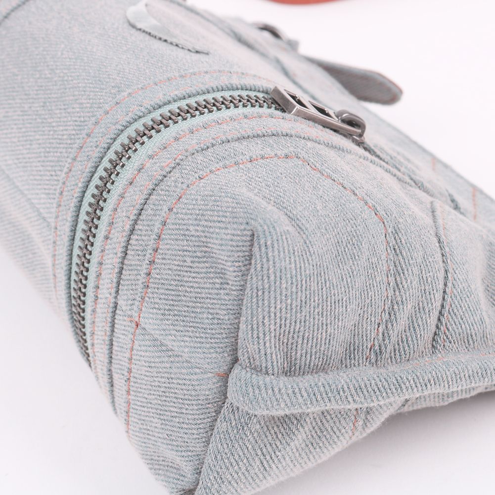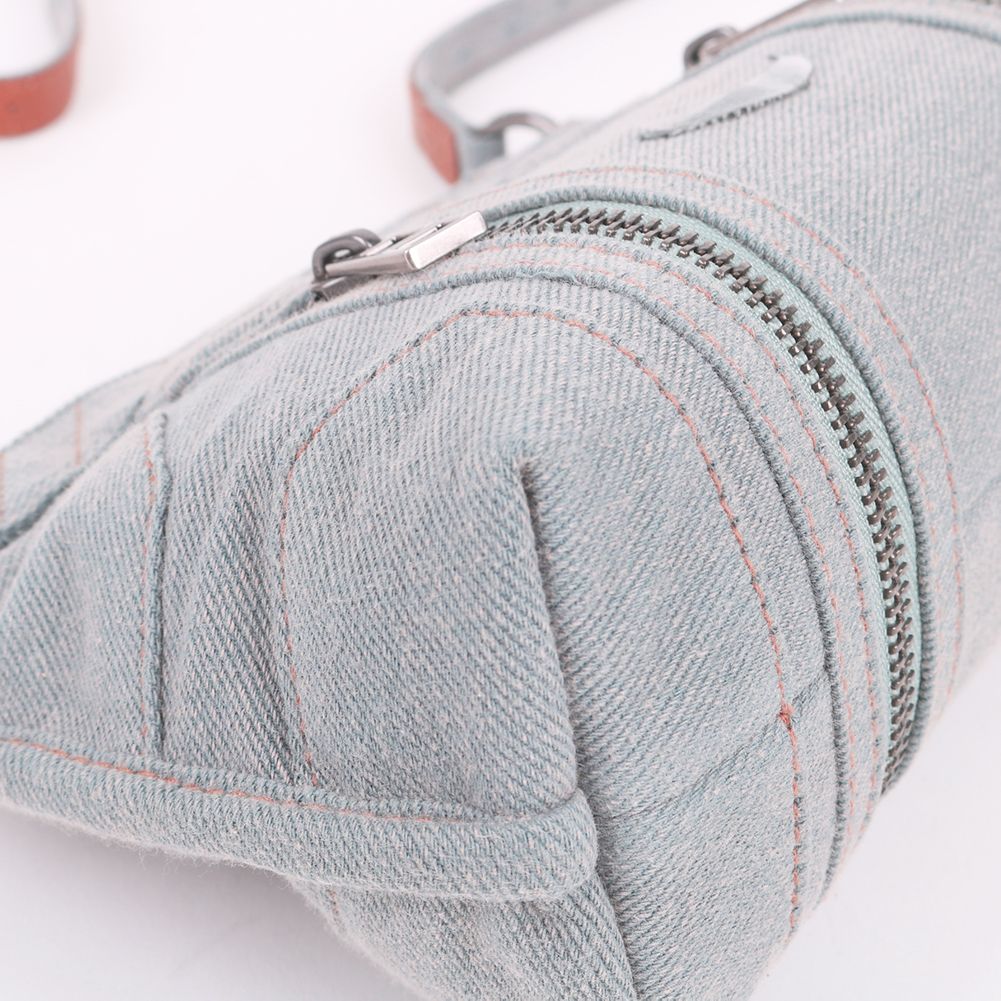 - Blue-grey denim leather material, zipper fastening